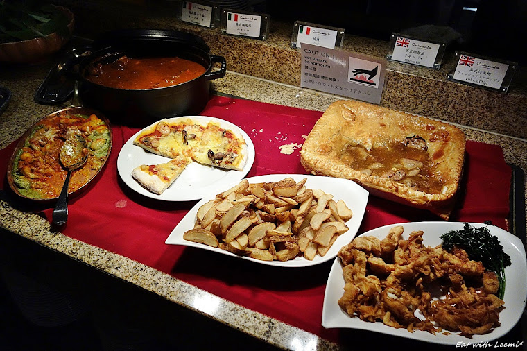接下來進入熟食區,說起來這裡應該才是歐風館的主力吧,各道菜的立牌上還會加一個代表國家的小國旗,最左邊的是海鮮義大利麵,好像這類Buffet都不可避免的吃不到彈牙的麵條,不過醬汁口味還不錯,旁邊的泰式咖哩蝦,海鮮和這種辛香料味比較強烈的咖哩醬汁還蠻搭配的,裡頭的蝦子尺寸也頗大,不過裹滿醬汁的帶殼海鮮剝殼時會非常不方便,拿個一點意思意思就好,旁邊還有一鍋蓋起來的是白飯和番紅花飯。