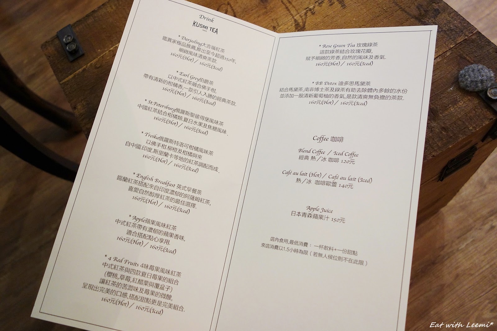 內用有飲品+甜點的低消限制,飲料單的部分內容有法國茶品牌KUSMI TEA、咖啡和果汁,分類不多,想想甜點才是這裡的主力。