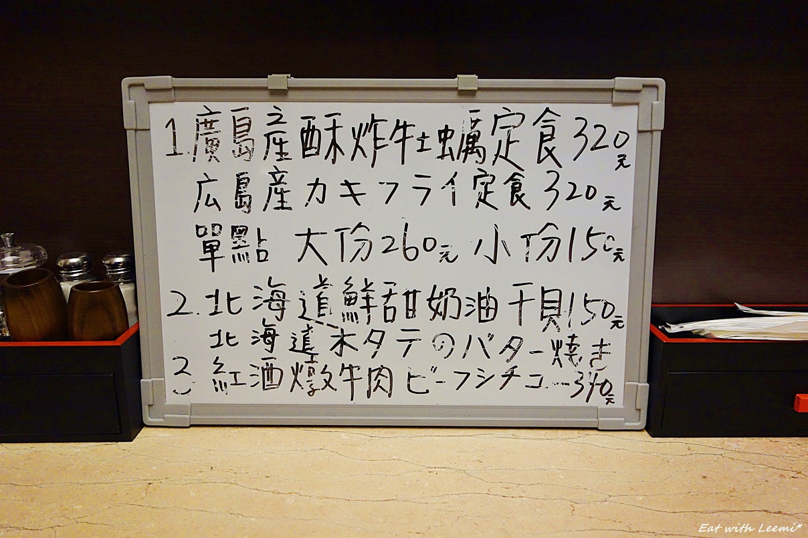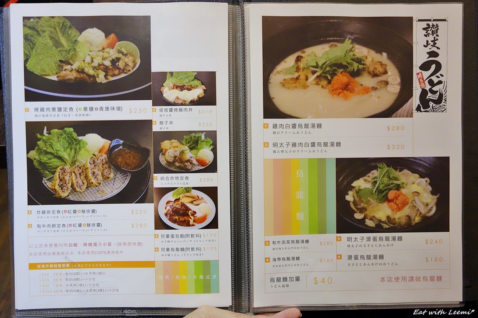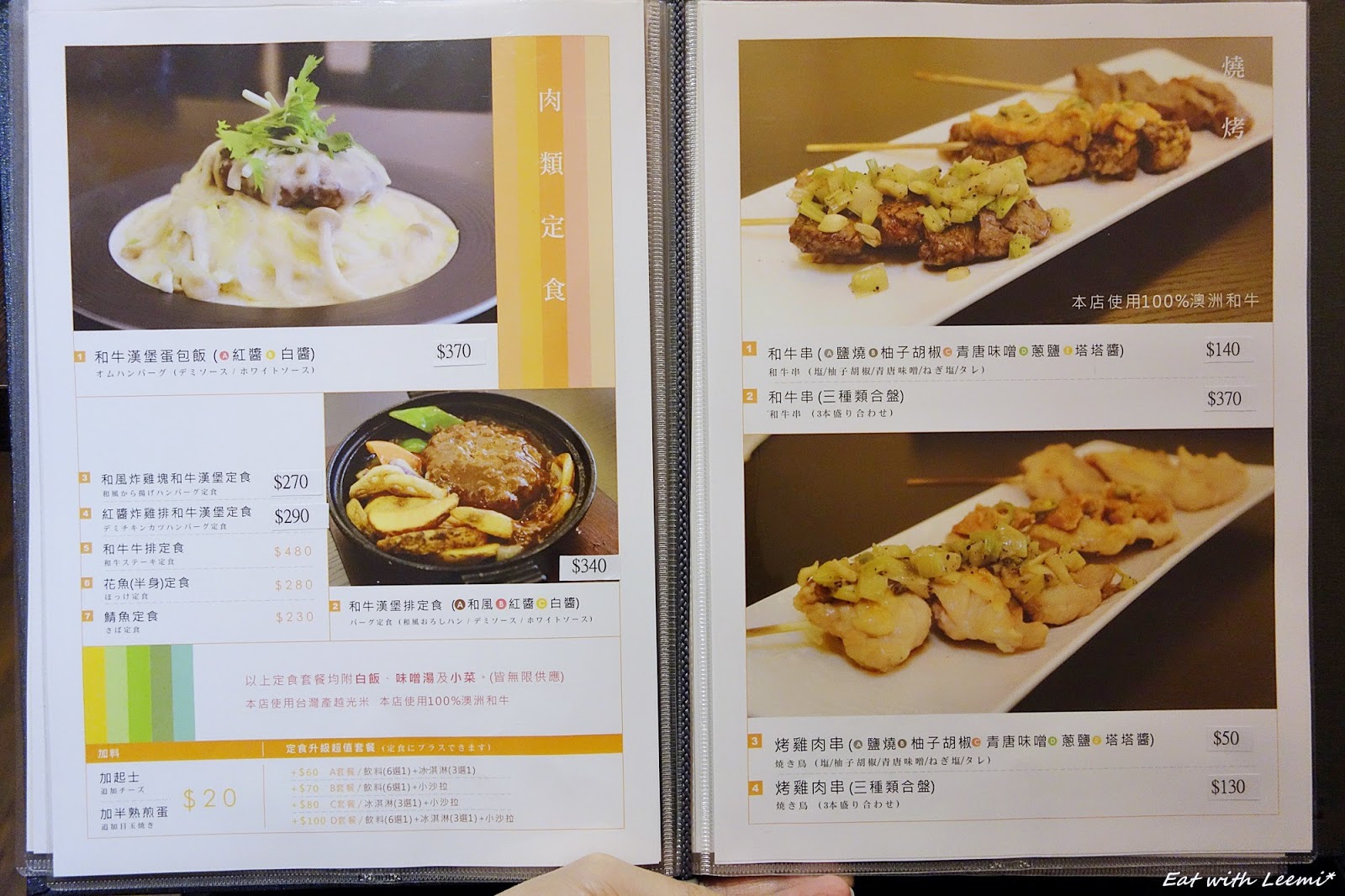 入座後馬上送來了茶和菜單,主食的部分以日式定食類和烏龍麵為主,還供應串燒、炸物和小菜,也有一些酒類,定食類的湯、飯和小菜都可以免費追加,烏龍麵也可以加價增量,另外還提供四種價位的加價附餐,是沙拉、飲料和冰淇淋的排列組合,最近也有推出幾款冬季限定的新菜單(寫在黑板上),另外食材方面有強調使用澳洲和牛。