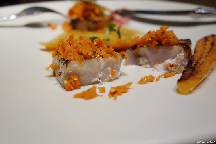 當日的菜色之中,馬加魚和另牛小排是少數上桌後能比較明顯感受到香味的菜色,氣味也是這道菜最讓人印象深刻的地方,半熟馬加魚搭上兩種不同處理手法的紅蘿蔔,以及糖燻飛魚乾製成的醬汁,甜味稍為突出一點,而蘿蔔本身也是帶甘味的食材,搭配起來還算融洽,雖然前道每道菜色看起來份量都不多,但到此已有飽意浮現。