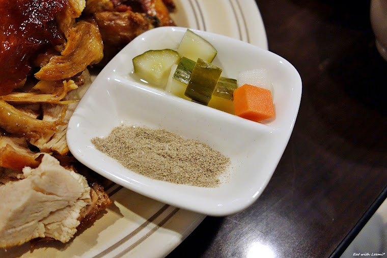 脆皮雞一份半隻,是採先蒸熟後淋油的作法,雞皮又香又酥很可口,相較之下雞肉比較無趣些,口感稍微有點乾柴,尤其胸肉更為明顯,還好搭著外皮吃多少可以拉回點分數,可以沾胡椒或配漬菜一起享用。