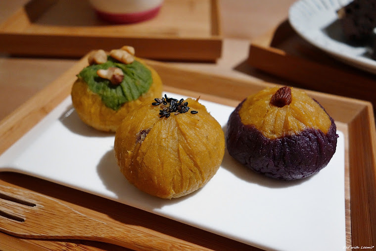 茶巾燒是以地瓜為主原料製成的甜點,不含奶蛋成份全素者也可以享用,三款分別搭配了紅豆、抹茶、紫地瓜和麻糬,整體甜度不算很高,感覺大部分來自於地瓜本身的甜,口感帶點軟黏,配茶一起享用剛好。