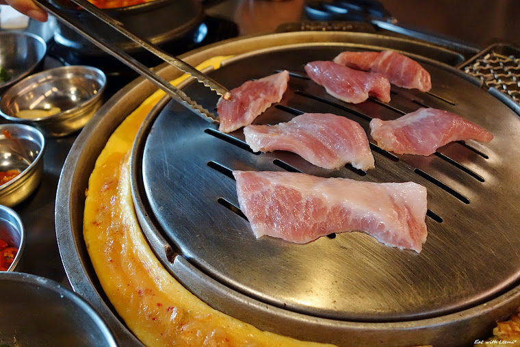 接著烤麻蒲松阪肉,也就是豬頸肉,烤過之後帶點脆韌的口感還蠻喜歡的,在這裡沒醃醬的肉都是用烤盤烤,輪到要烤醃漬過的肉之前記得請店員來換成烤網。