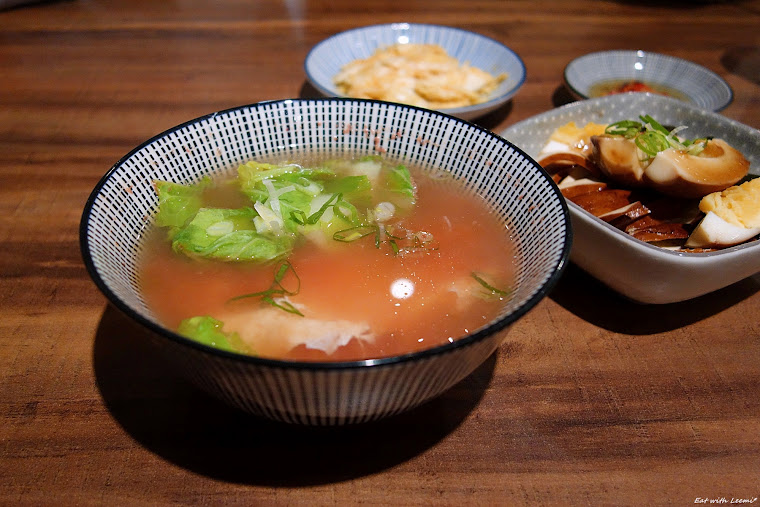 餃子類都是套餐形式,皆附一款小菜和湯品,這天涼拌干絲缺貨,是以黃金泡菜代替,安定的開胃感但分量不多,番茄蛋包湯清淡爽口,是那種沒有多餘調味的討喜家常風,非常暖胃。
